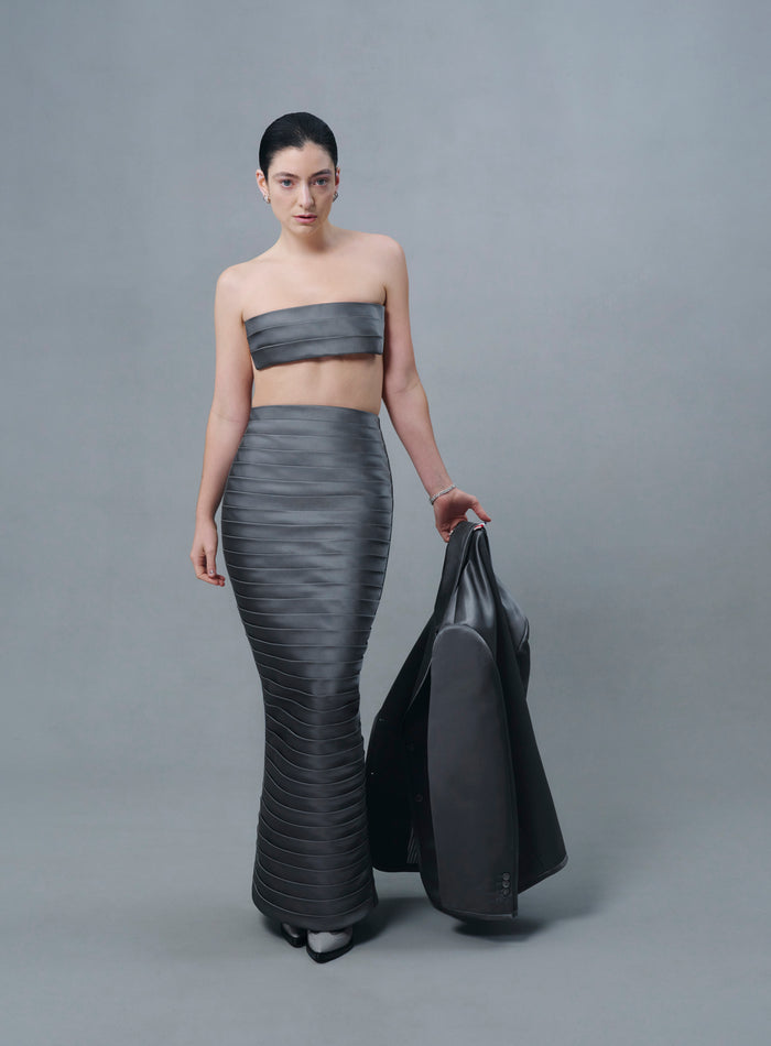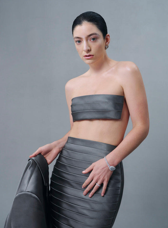 lorde wears a custom thom browne dark grey duchess satin cummerbund-style skirt and matching backless top with an oversized sack-style jacket and longwing brogues in funmix grey patent leather…