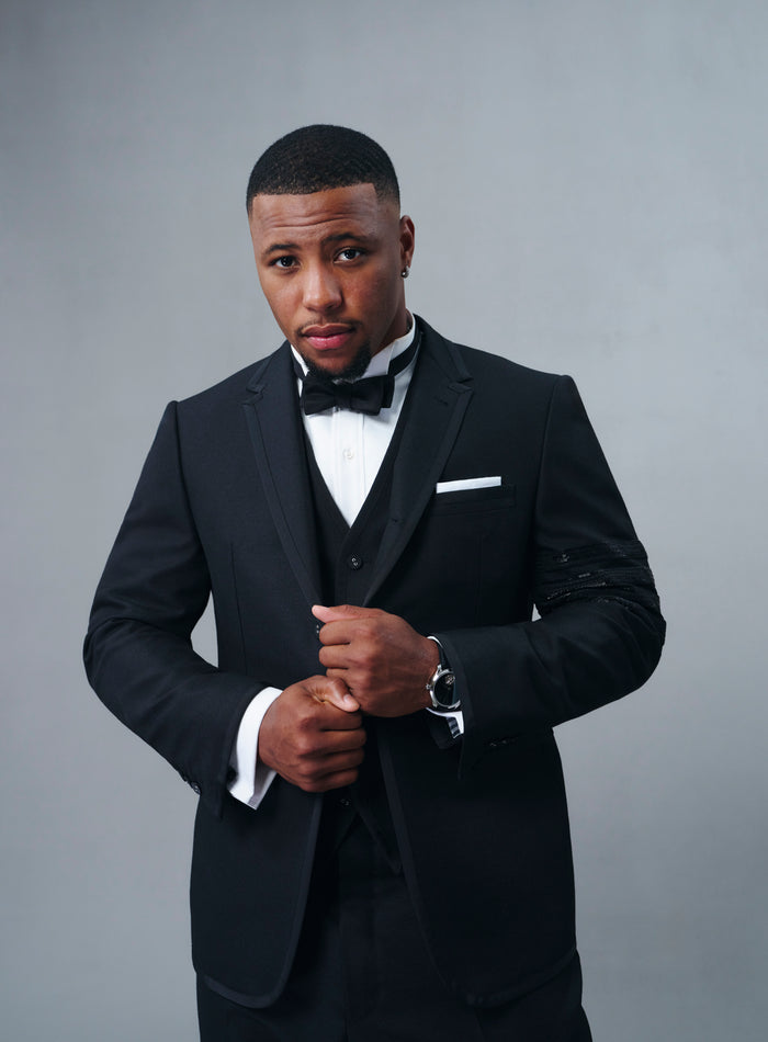 saquon wears a custom thom browne 3-piece classic tuxedo in black 3-ply mohair, tipped with tonal black grosgrain, with a hand-embroidered 4-bar in black tonal matte and shiny bugle beads, and longwing brogues in black patent leather…