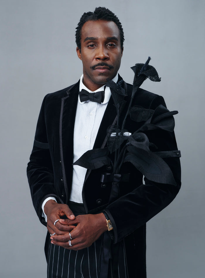 tramell wears a custom thom browne elongated tailcoat in black velvet, tipped in black silk satin and adorned with a bouquet of handcrafted calla lilies, realized in silk duchess, organza overlay with beading embroidery, and frayed silk faille, attached to the chest with a silk satin ribbon…