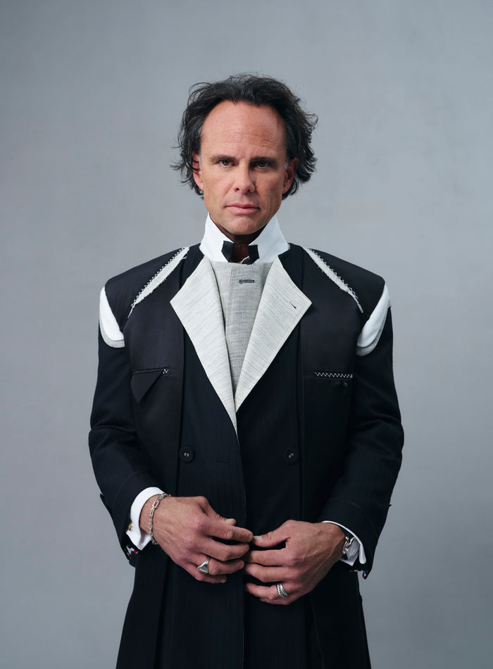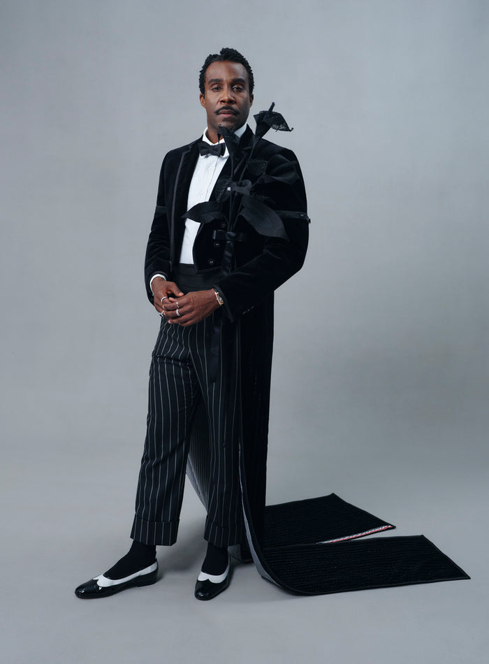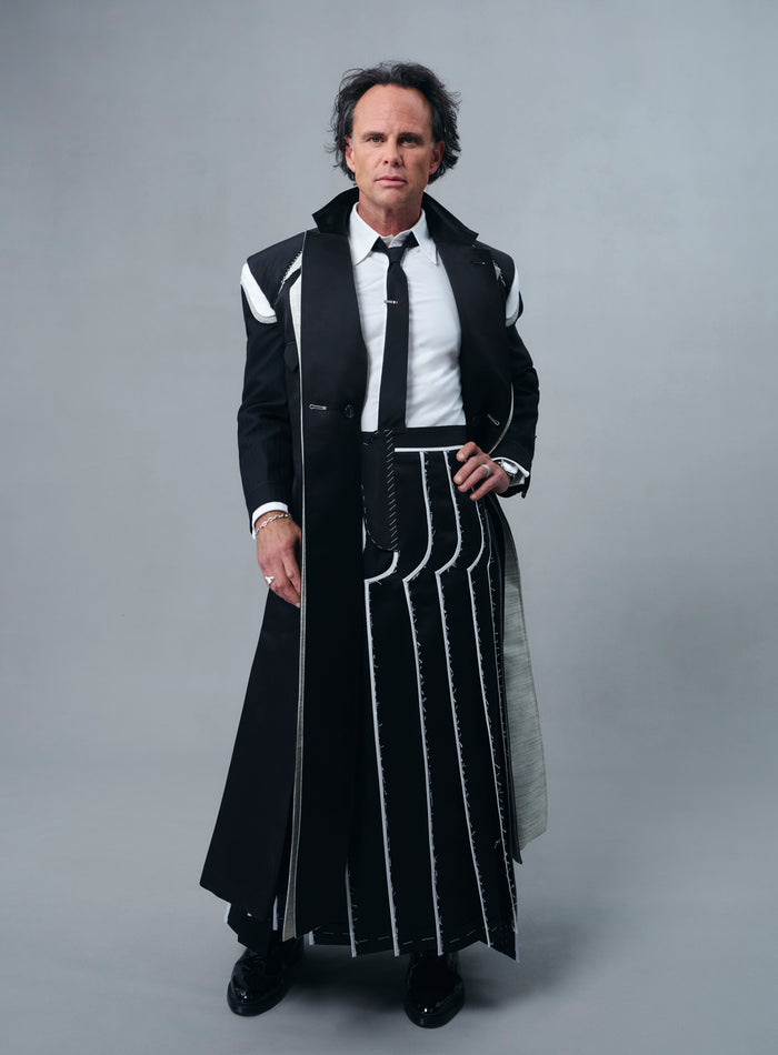 walton wears a custom thom browne ‘inside-out’ overcoat with a pleated skirt back detail in a combination of tonal wool suiting, black double duchess silk and exposed canvas, finished with external silk and cotton-covered shoulder pads and tailoring hand stitches. the “inside-out” ankle-length pleated skirt in 3-ply wool mohair with tonal silk faille pleat inserts is bound with white silk faille and finished with hand-marking stitches. the overcoat, worn over a classic oxford shirt with a back silk faille tie. his shoes are longwing brogues in black patent leather…