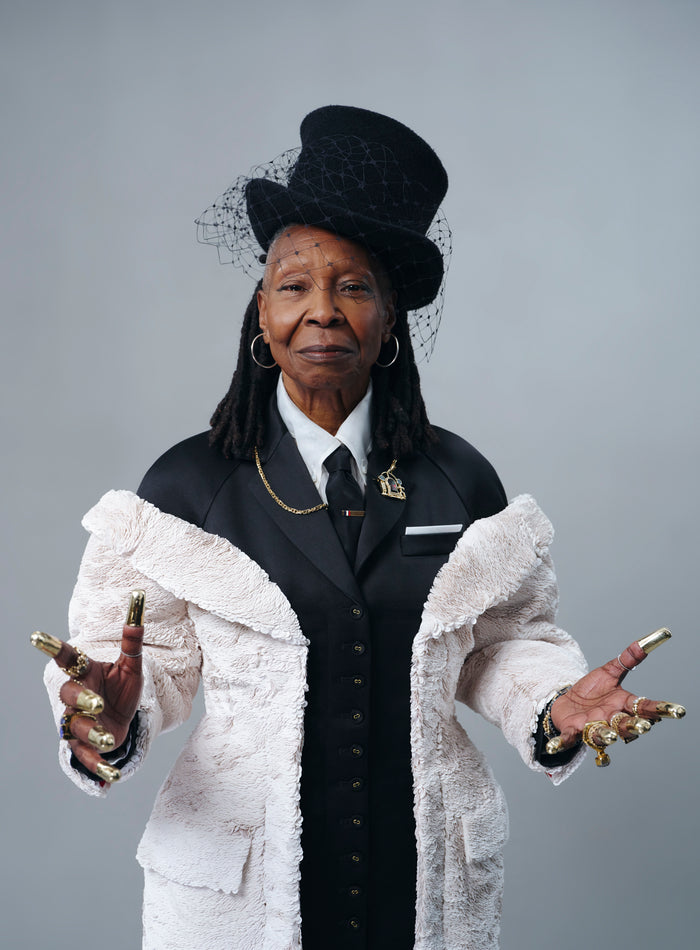 whoopi wears a custom thom browne black duchess satin raglan-sleeve tailored dress and heavily embroidered, stacked matte white sequin overcoat with lacing detail down the center back, a top hat in wool bouclé from the fall 2015 archive, and longwing boots in black and white patent leather…