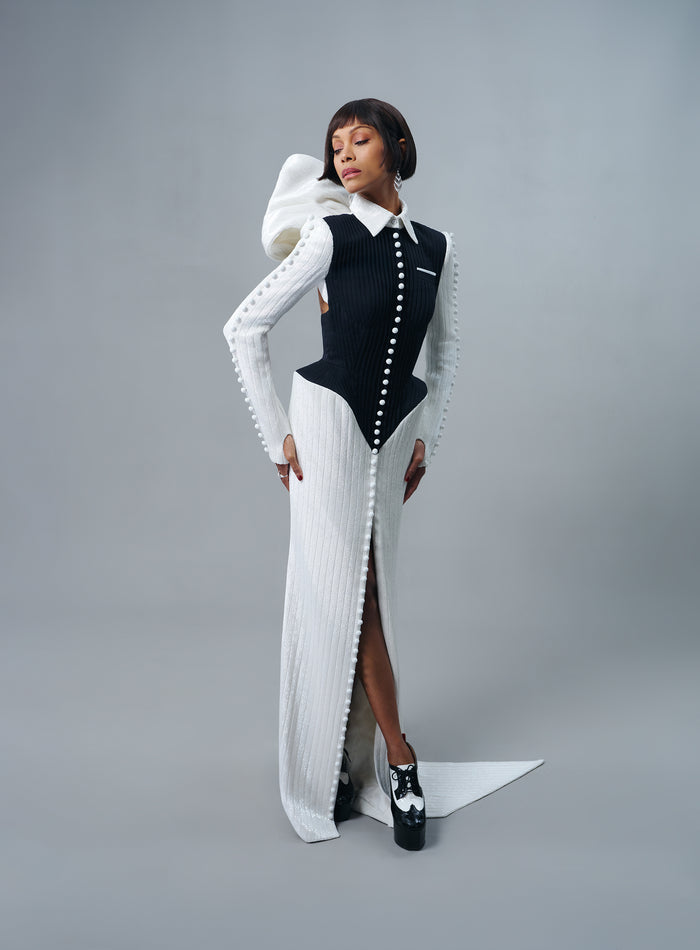 zoe wears a custom thom browne tuxedo dress with a black plissé piqué bodice, a shiny white embroidered bugle pinstripe sleeve and skirt with an extended bow, and longwing brogue platforms in black and white patent leather…