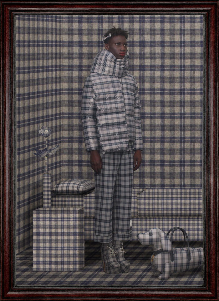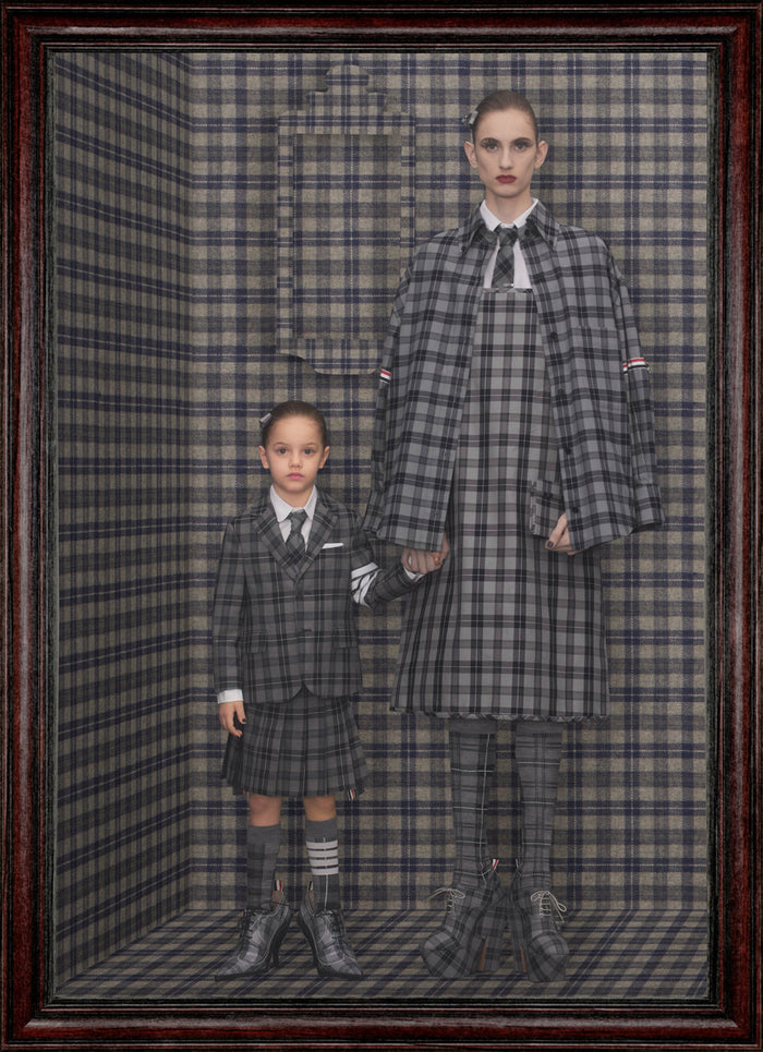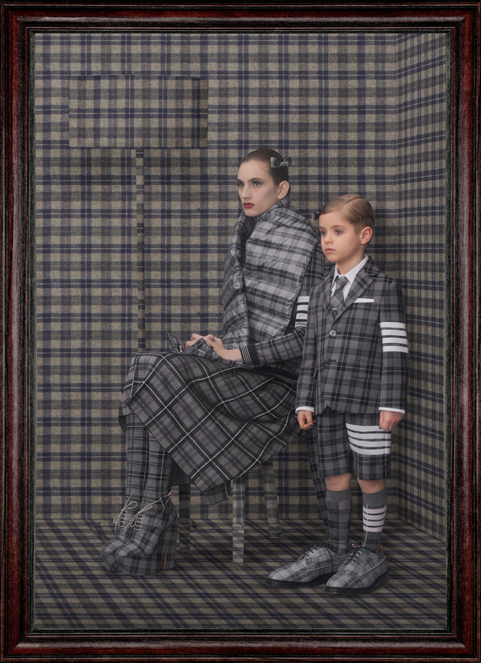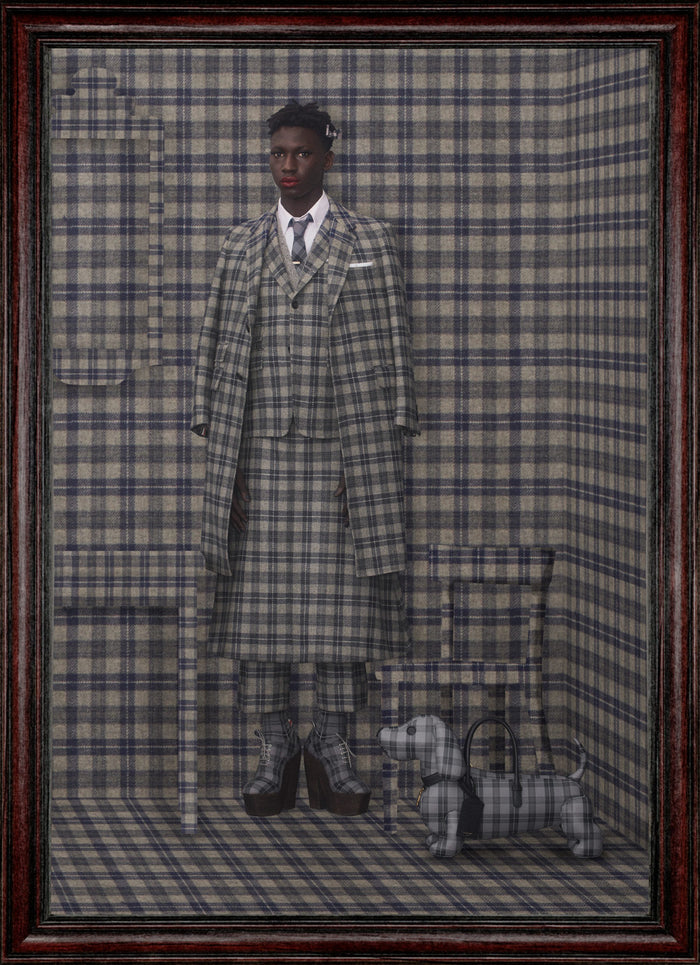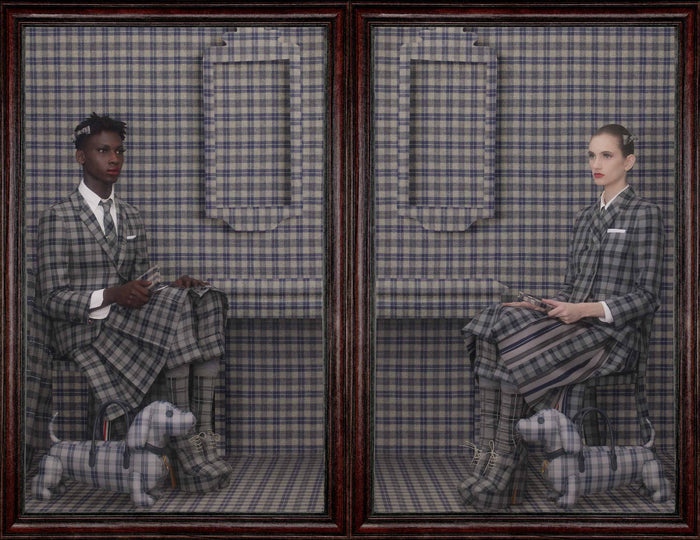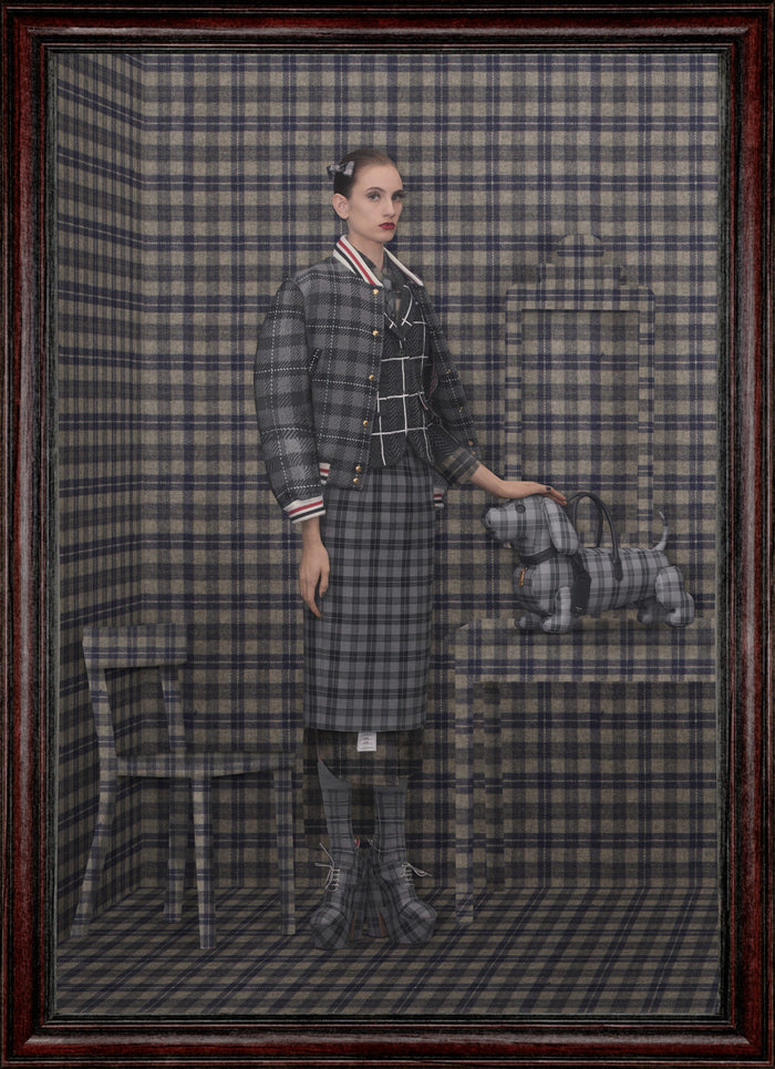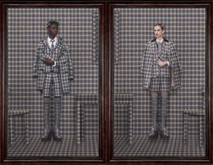 Thom Browne shares a portfolio of images featuring his proprietary grey and navy tartan. The signature tartan design first appeared in his Fall 2006 menswear collection.