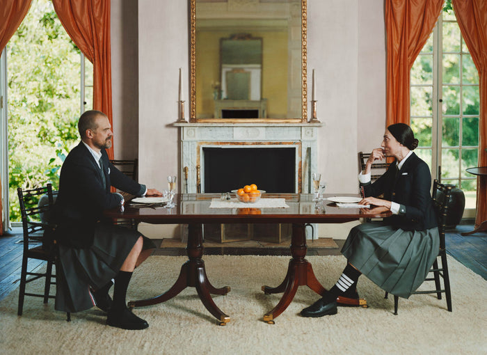 David Harbour and Anh Duong star in a portfolio of images for Thom Browne, shot by Tina Barney at the iconic house Teviotdale in upstate New York. Through the images and film, Thom Browne references classic ideas of American painting, reinterpreting the expected in his own way, and showing his tailoring on different types of people. In this context, we are introduced to the core collection of Thom Browne men’s and women’s offering.