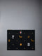 Medium document holder in black pebble grain leather with brass snap details in a polka dot pattern. Brass zip top closure, gold foil logo printed at entry. Signature striped grosgrain loop tab at entry.