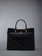 Large duet tote in blue pebble grain leather. Double rounded leather top handles, large front folio pocket. Brass hardware. Gold foil printed logo and signature striped grosgrain loop tab at front pocket entry.