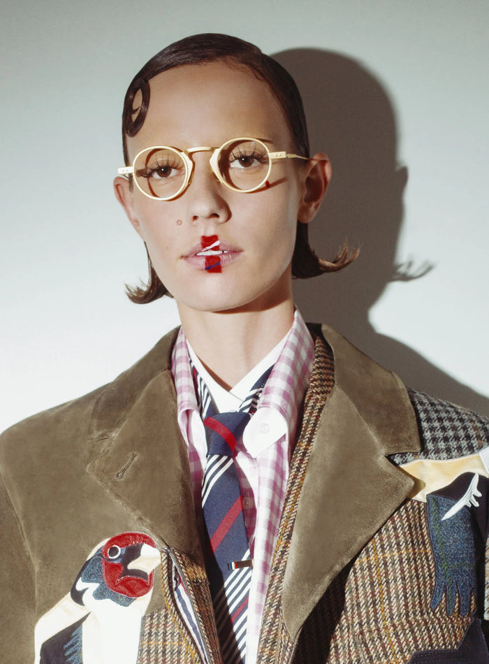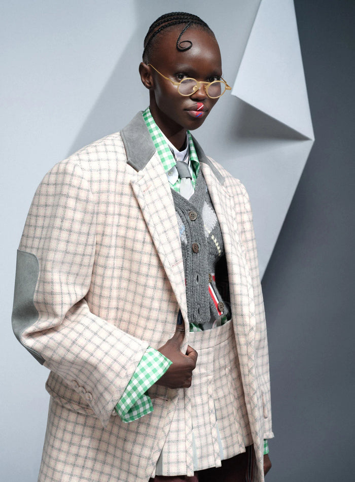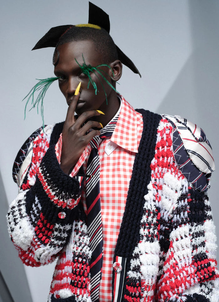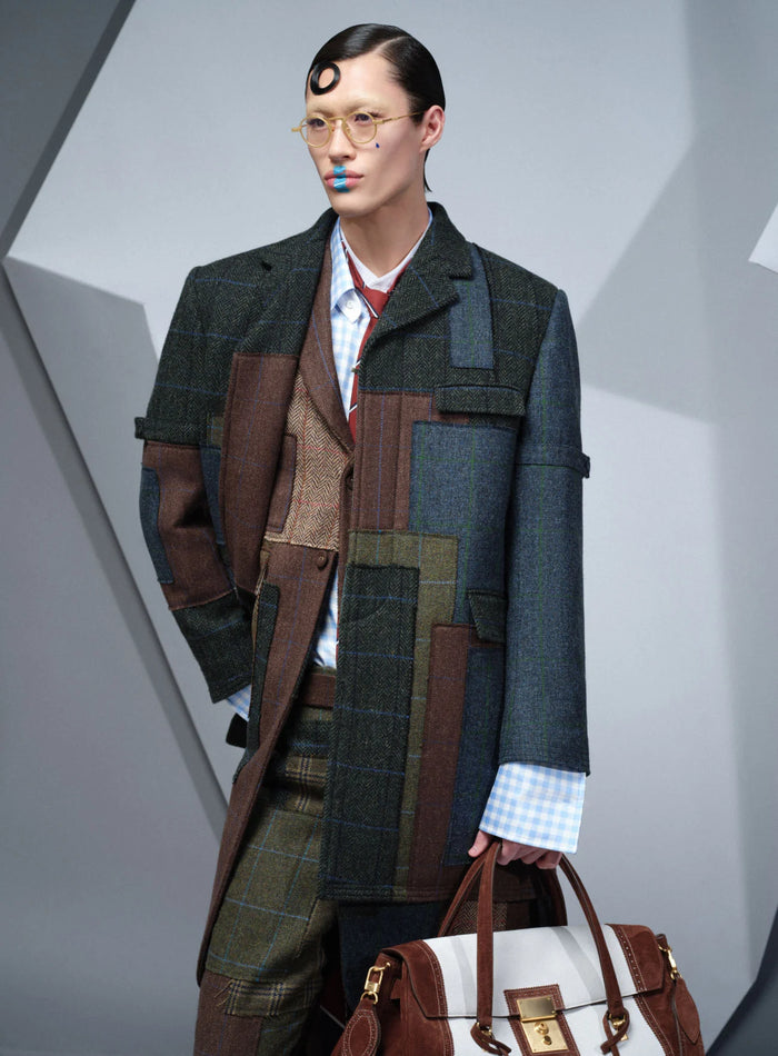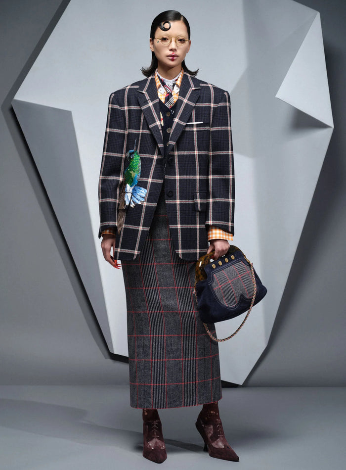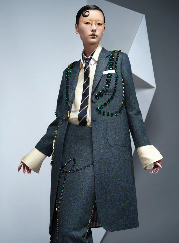 the hallmarks of traditional menswear tailoring reach from the outside in: suede elbow patches and contrast collars complement self-covered buttons, belts, and armbands, while modular shirting in vibrant gingham silk feature removable collars and cuffs akin to gilded age tuxedo shirts. emblazoned with “65” in reference to thom’s birth year, a tweed football pinnie and chocolate brown suede varsity jacket pay homage to collegiate classics. elsewhere, sequin, boucle yarn, silk ribbons, and featherlike thread converge in red, white, blue, and silver tweeds. 3,500 black, silver, and clear swarovski crystals are skillfully linked into a trompe l'oeil dress that alludes to the classic thom browne uniform. a striking level of detail, both functional and decorative.