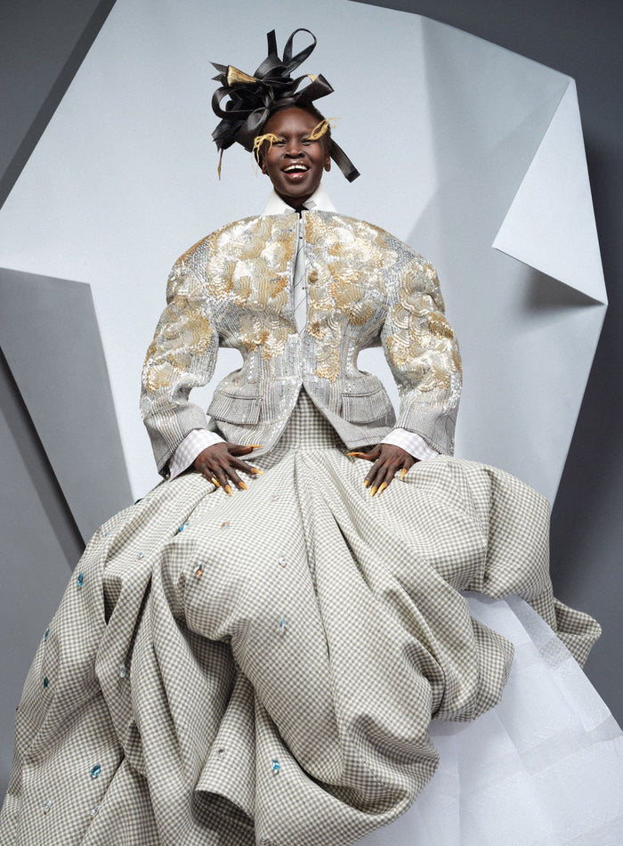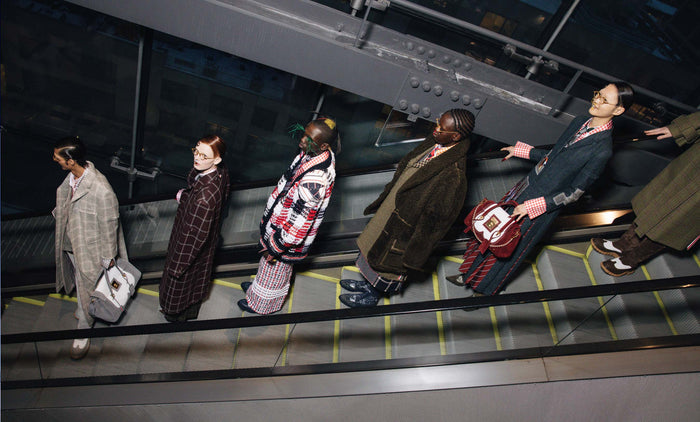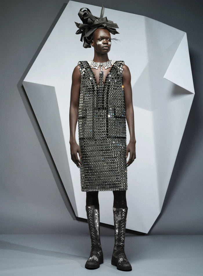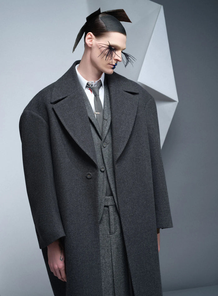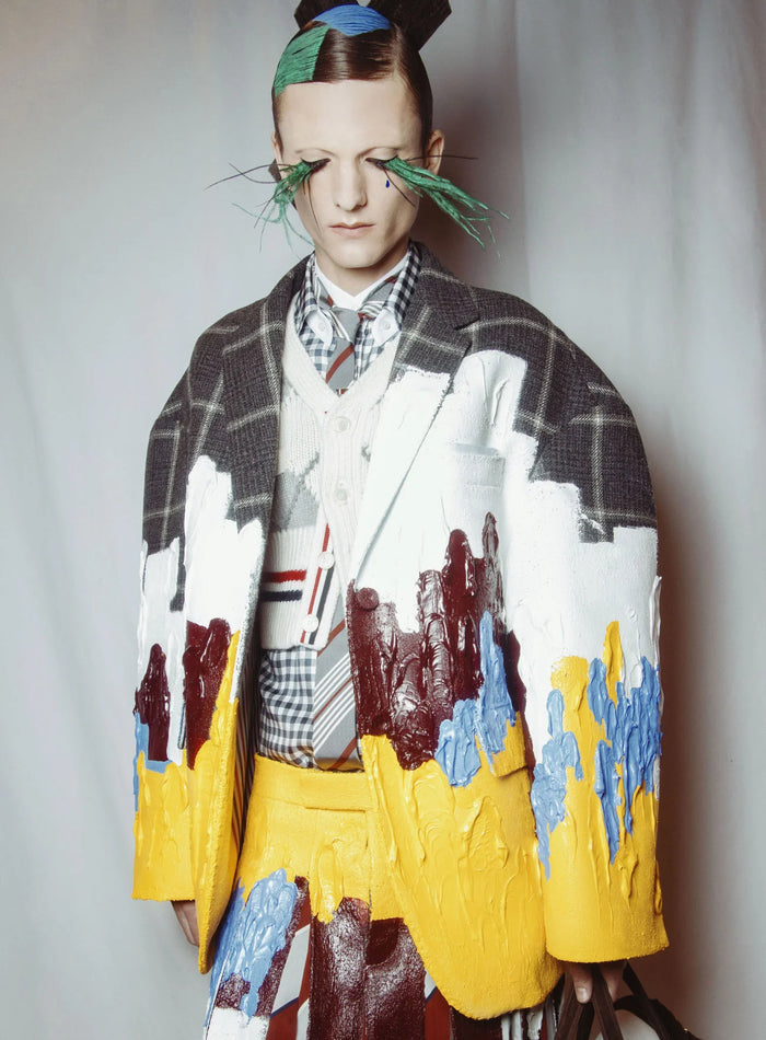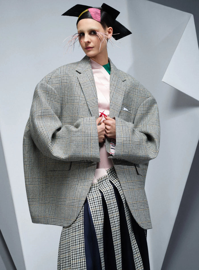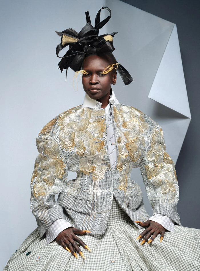 the hallmarks of traditional menswear tailoring reach from the outside in: suede elbow patches and contrast collars complement self-covered buttons, belts, and armbands, while modular shirting in vibrant gingham silk feature removable collars and cuffs akin to gilded age tuxedo shirts. emblazoned with “65” in reference to thom’s birth year, a tweed football pinnie and chocolate brown suede varsity jacket pay homage to collegiate classics. elsewhere, sequin, boucle yarn, silk ribbons, and featherlike thread converge in red, white, blue, and silver tweeds. 3,500 black, silver, and clear swarovski crystals are skillfully linked into a trompe l'oeil dress that alludes to the classic thom browne uniform. a striking level of detail, both functional and decorative.
