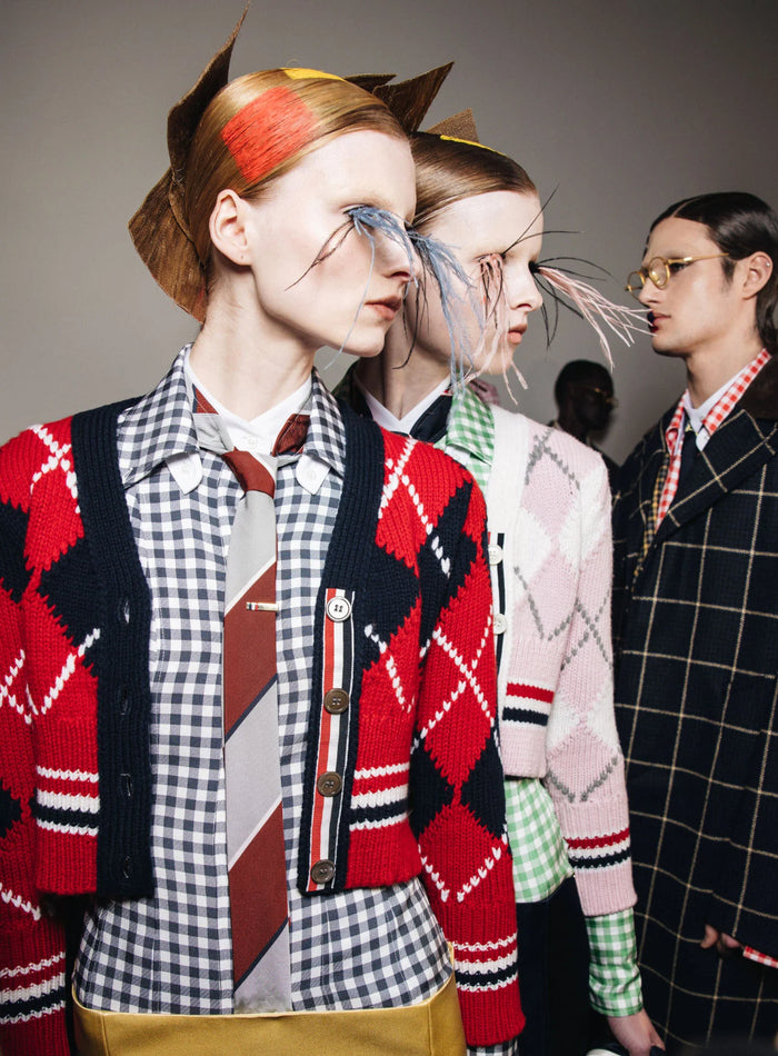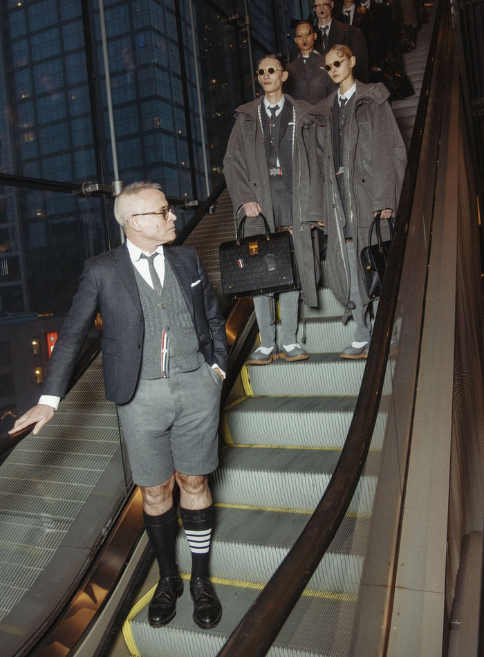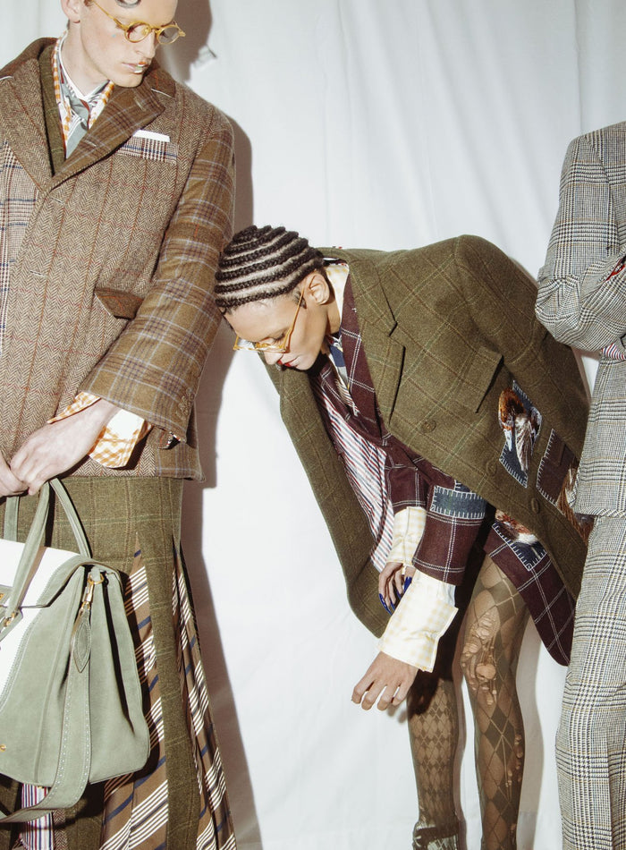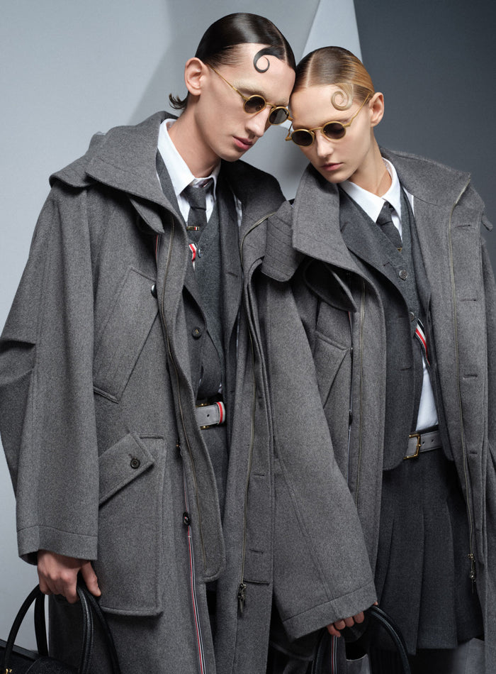 cloaked in hooded parkas, a pair of ornithologists enter wearing double-faced wool iterations of the thom browne uniform. their semi-sheer argyle stockings peek out from over-the-knee suede waders. they sit at their perch, a white folded desk and chairs, ready to observe what’s to come.