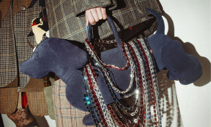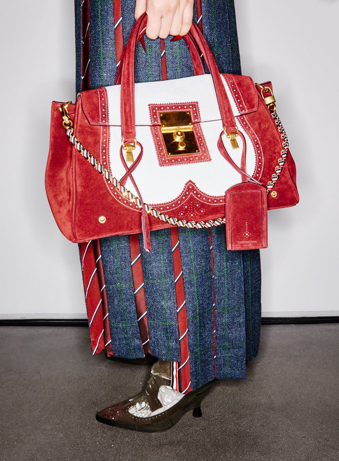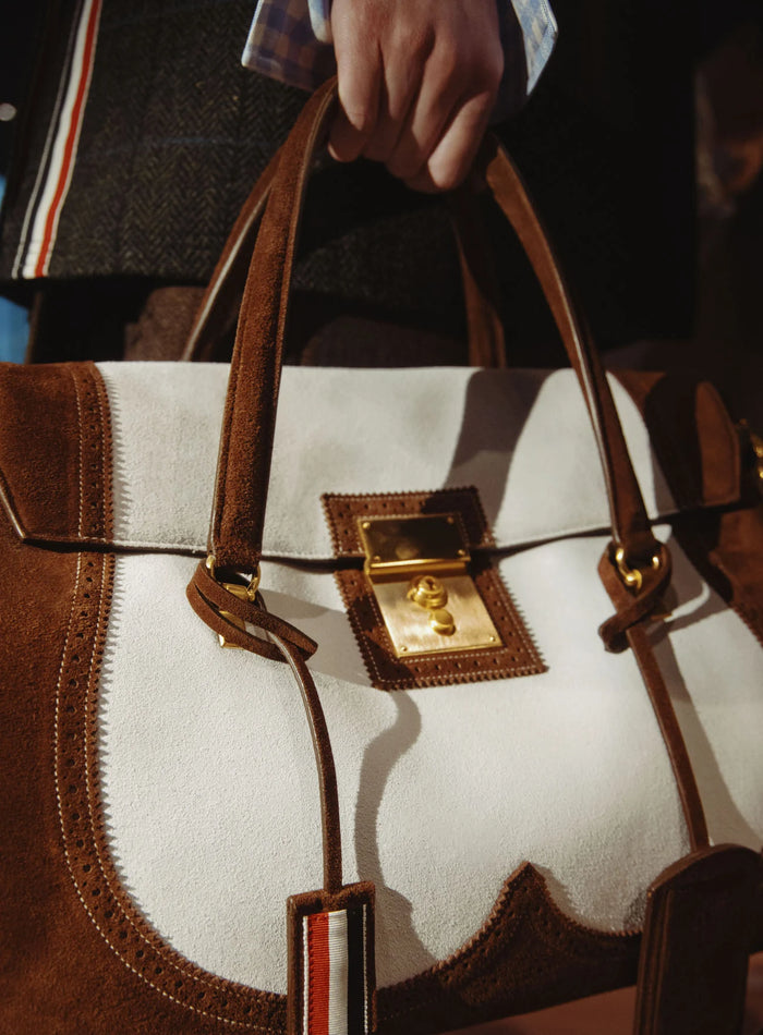 from beloved hector to the iconic mr. and mrs. thom luggage bags to pumps, tuxedo slippers, and longwings of all heights, accessories and footwear are fully realized in brogued suede with a two-tone spectator color scheme—some veiled by argyle stockings and others punctuated by silk pom-poms and swarovski crystals.
