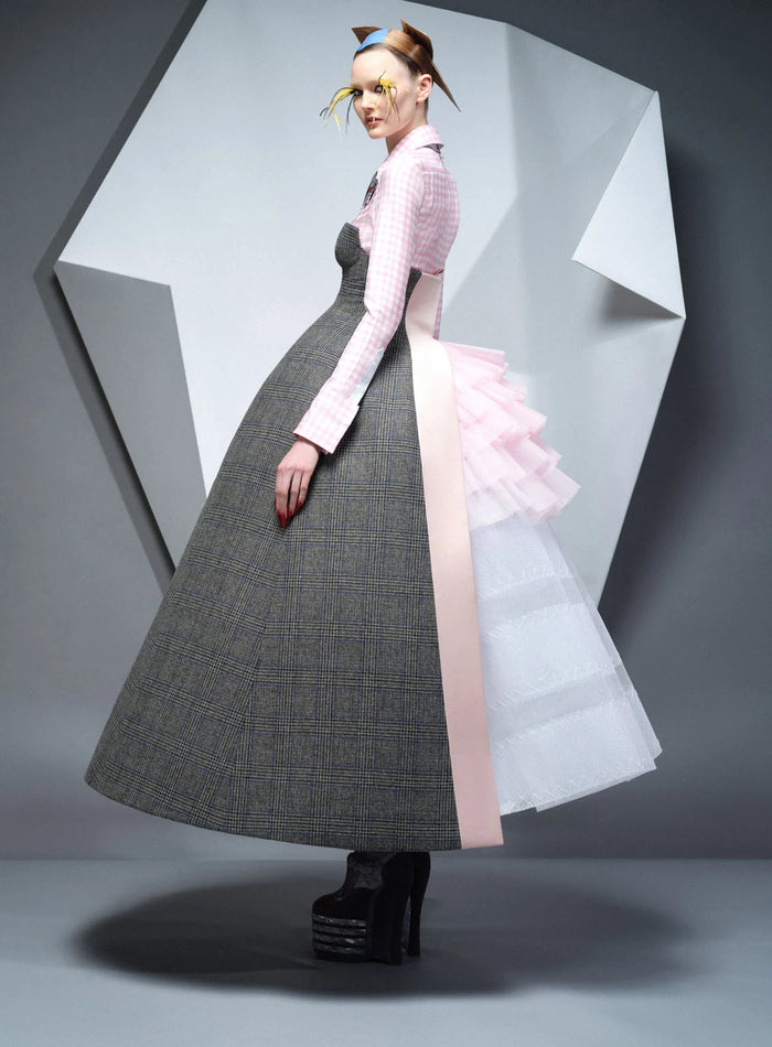 that dynamic sense of movement reappears in tweed and silk duchess satin dresses. side swept silhouettes that contour the body began as pleated skirts twisted on a form, while the inverted box pleats of stand collar dresses reveal repp stripe silk with every move. pops of yellow evoke thom’s high school mascot, the canary. by contrast, silk trompe l’oeil dresses lie flat on off-the-shoulder origami-inspired looks backed by unfinished petticoats. in the end, a rare bird emerges in a gold bullion embroidered grey suit jacket that catches the light and a sweeping ball skirt carefully draped with 40 meters of heritage tweed.
