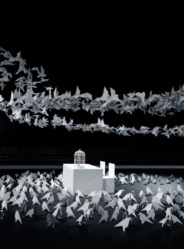 surrounded by 2000 origami paper birds, two caged love birds long to be free. as they peer through the enclosure, a fantastical flock flies past. “how marvelous would it be,” they wondered, “to be exactly who we wish to be?”