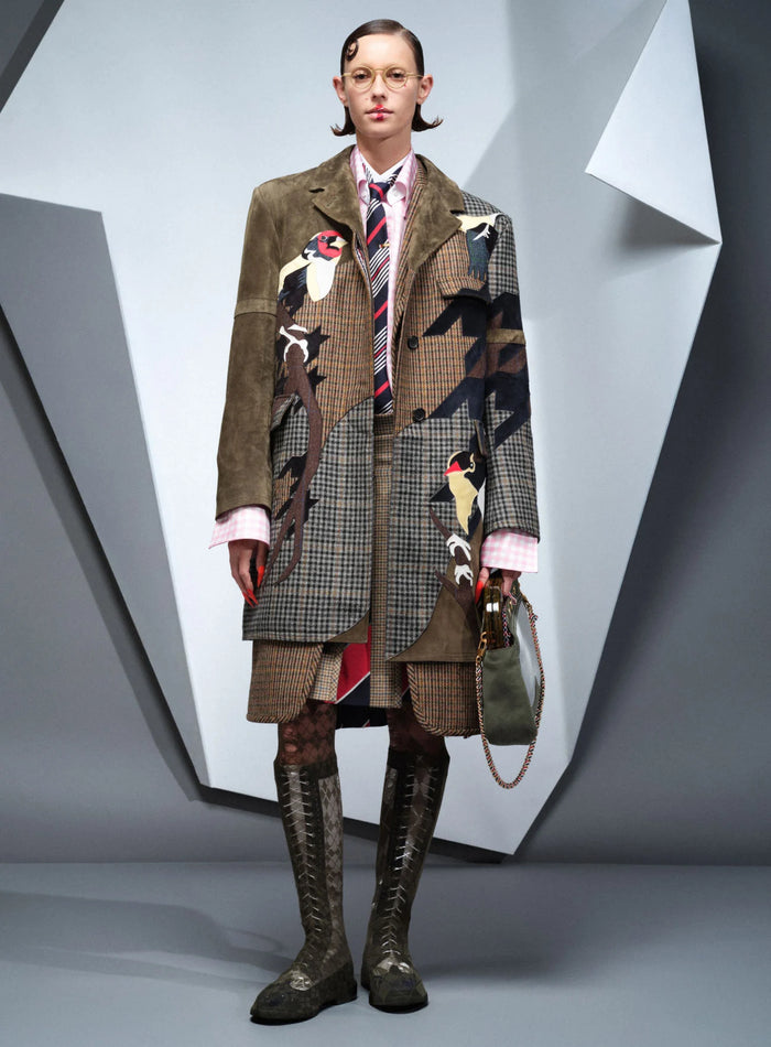 birds of pure fantasy come to life atop herringbone, glen plaid, houndstooth, and windowpane checks. created through the collaborative drawing exercise “exquisite corpse,” these entirely imagined birds are rendered in satin stitch and gold bullion embroidery. sitting on pockets and gliding across patchwork coats, they’re joined by silk intarsia counterparts: surrealist herons with drawn out legs and a magpie stealing emerald green swarovski crystals.
