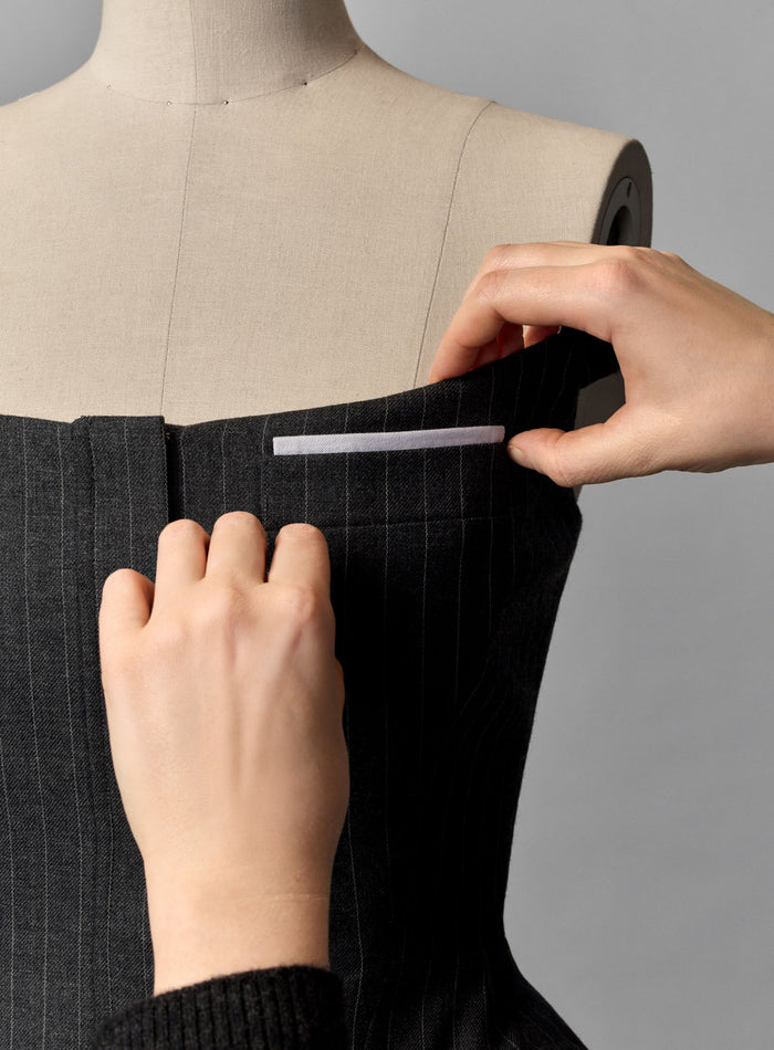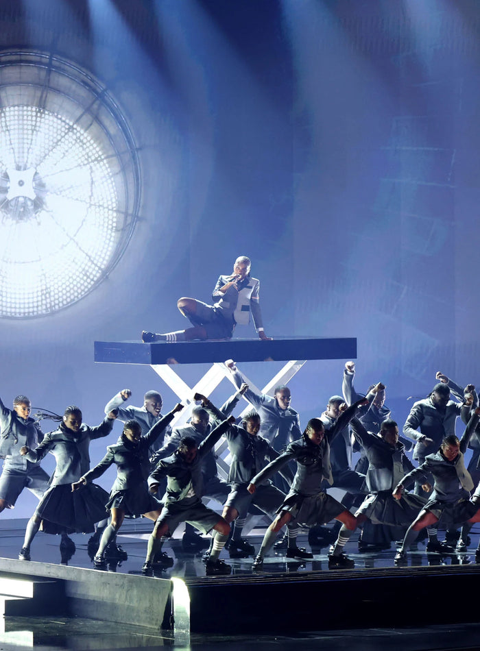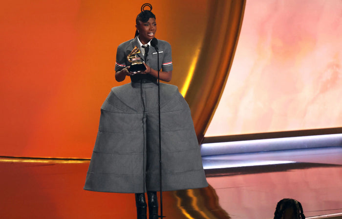 to receive her grammy award, doechii wears a cropped raglan-sleeve armband jacket in medium grey wool with matching high-waisted pannier trousers over a tuxedo-style corset in dark grey 120s wool, a white cotton oxford shirt, a matching wool tie and platform longwing brogues in black pebble-grain leather.