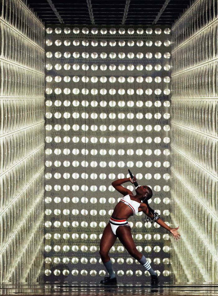 to perform ‘catfish', doechii wears a funmix wool fresco high armhole sportcoat with red, white and blue armband detail with matching funmix sack shorts, classic white oxford shirt, a custom white cotton jockstrap brief and matching demi cup bra with red, white and blue grosgrain detail and tassel loafers in polished black calf leather.