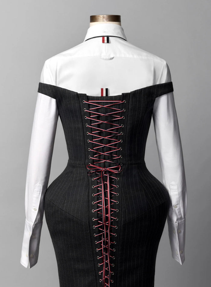 on the red carpet, doechii wears an off-the-shoulder, exaggerated-hip corset dress in dark grey pinstripe wool with red, white and blue lacing, layered over a white cotton oxford armband shirt and paired with a matching wool tie and platform penny loafers in black pebble grain leather.