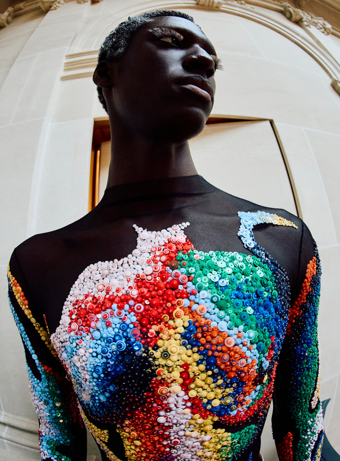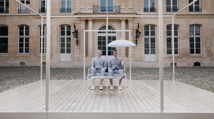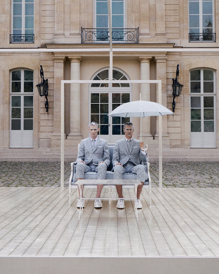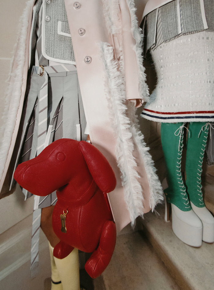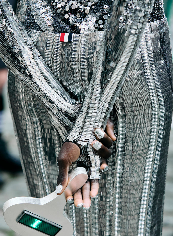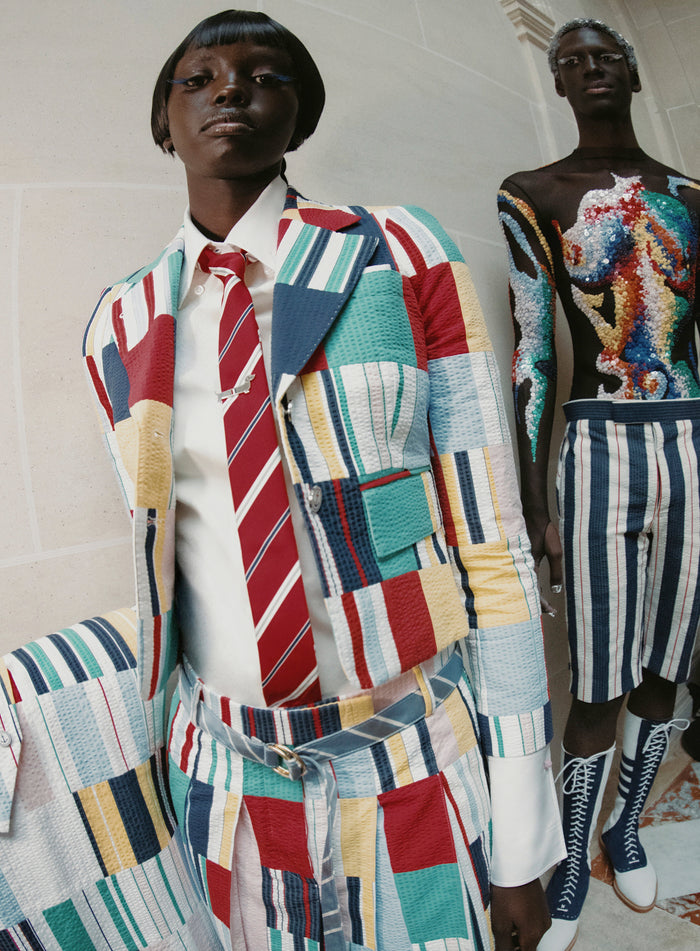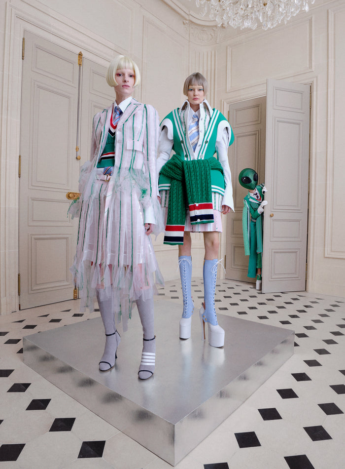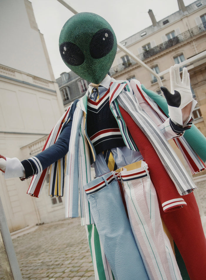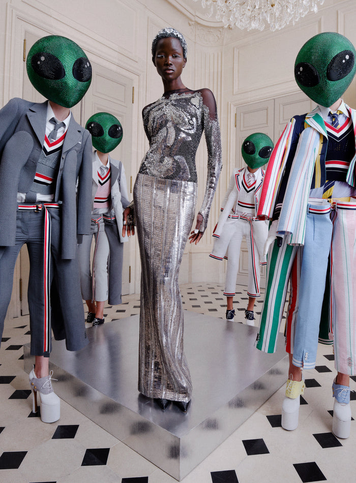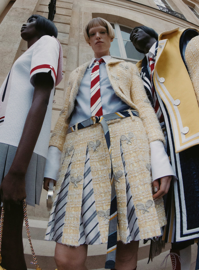 bright preppy palettes elevate chromatic contrasts. repp stripes are woven, embroidered, multiplied, thom’s classic techniques of the past. twenty years stretched to their limits. tweeds and seersucker mingle with sterling silver grommets and rings. selvedge patchwork and sequined tulle shimmer like signals across the spectrum of light…