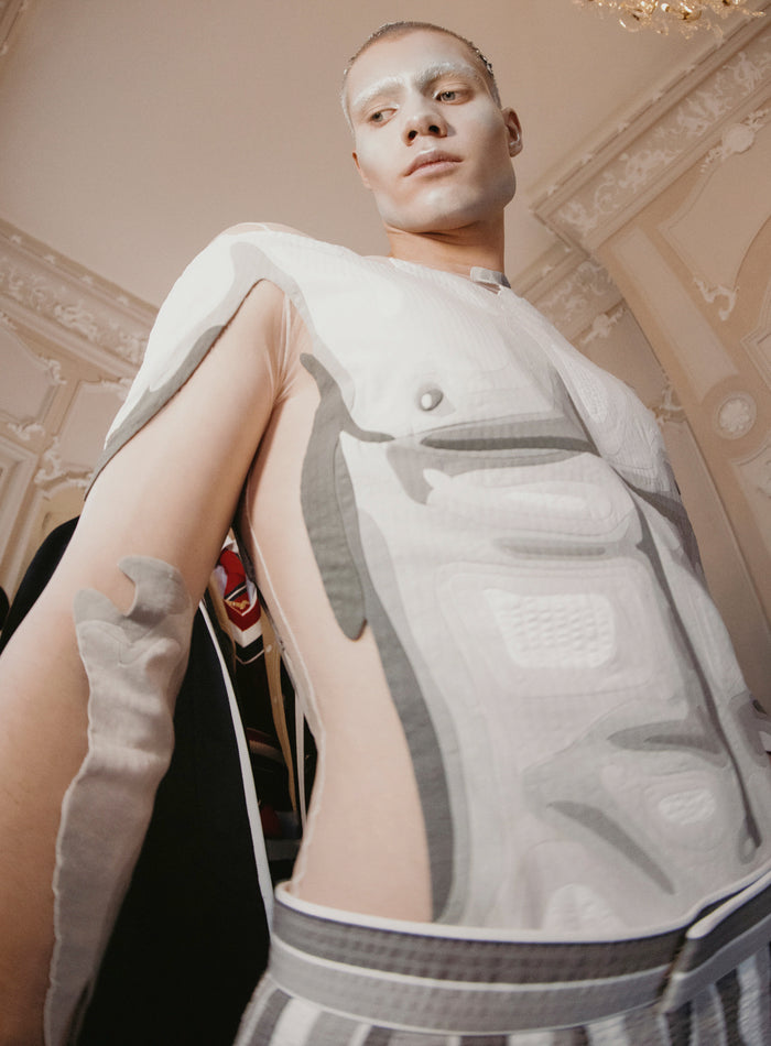 unidentified objects make contact, touching down, drifting into the room. the unearthly visitors glide forth in deconstructed, then reconstructed, humanoid proportions. morphing and evolving, harmony forms in the parallels between the space invaders and extraterrestrials. some wear trousers with four legs, some with two. no two pieces are quite the same, nor quite so different…
