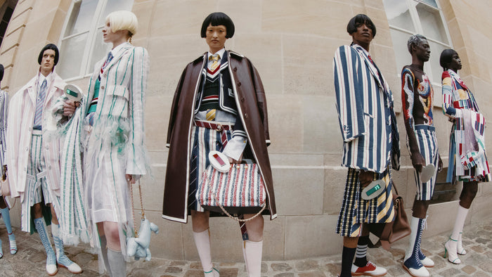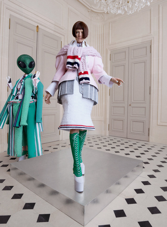 structured flare creating thom’s new look for tailored dressing. skirts are lowered to a drop-waist and belted, pleats unfolding, softly draped just above the knee. the cricket sweater, layered within, a foundational thom browne design, is shrunken and cropped.
