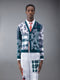 Classic V-neck cardigan in Fun-Mix tartan and paisley Merino wool jacquard. Front button closure with striped grosgrain placket. Buttoned side vents and cuffs with signature striped grosgrain trim. Signature striped grosgrain loop tab at back of neck.