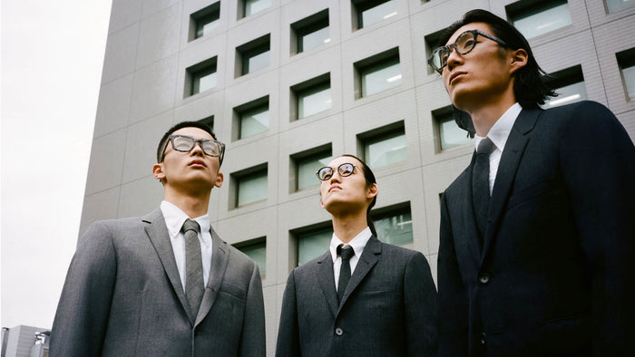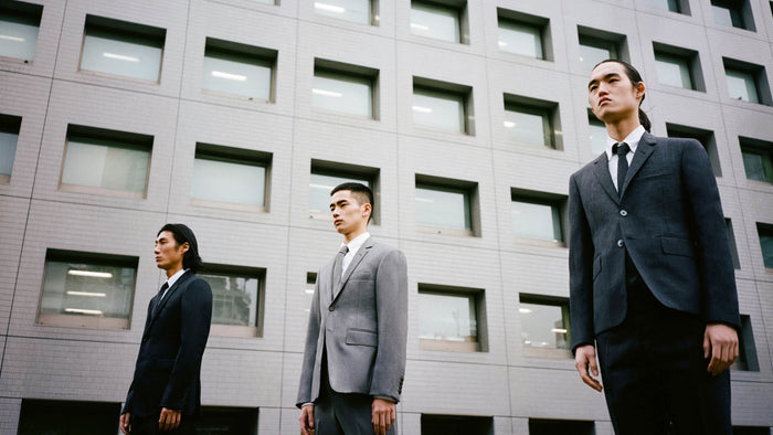 Model are wearing dark grey super 120's twill wide lapel two-piece suit and tie