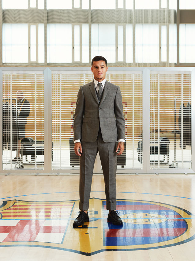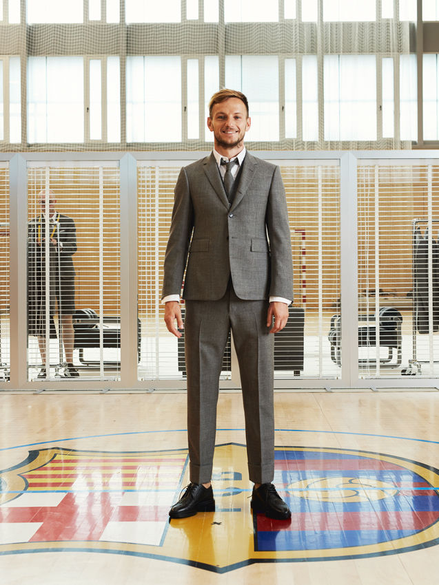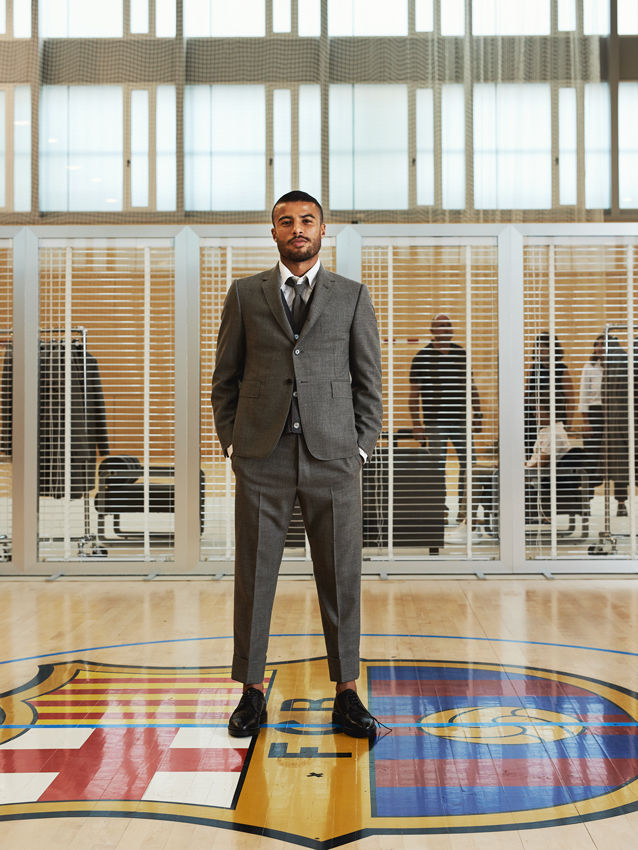 リオネル・メッシ、ジェラール・ピケ、サミュエル・ウンティティとチームメンバーは全員、クラシックなグレーのウールスーツとネクタイ、カシミアの4BARカーディガン、黒のウィングチップブローグ、白のボタンダウンオックスフォードシャツを身にまとい、チャンピオンズリーグとラ・リーガのアウェー戦で着用する予定だ。