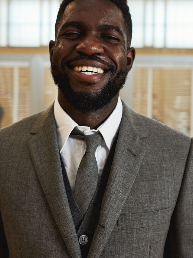 2018年8月。スペイン、バルセロナのシウタ・エスポルティバ施設にあるトム・ブラウンの移動式アトリエで、写真家のナチョ・アレグレが、オーダーメイドのユニフォームスーツのフィッティング中のFCバルセロナチームを撮影しました。