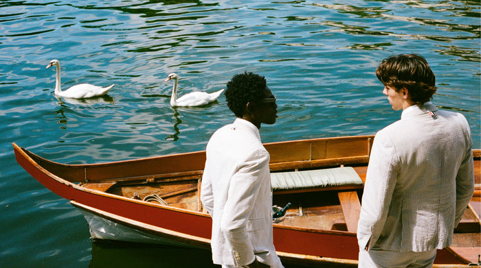 このコレクションの核にあるのは、「繊細さ」と「構築性」のバランス。花咲く野原と輝く水面のあいだで、ゲストたちはケリーグリーン、スカイブルー、ライトピンク、バターイエロー、ディープネイビーをまとって集います。そのすべてが、トム ブラウンの表現世界を広げるために設計された洗練されたカラーパレット。個性と多様性を受け入れる、柔軟性のある色。その上で、鋭く仕立てられたシアサッカーのテーラリングがコーディネートの軸となり、鮮やかなレイヤーとの間にクリアな対比を生み出します。このコレクションは、トム ブラウンのテーラリングという共通言語を、色という洗練されたフィルターを通して再解釈したものです。ラグジュアリーなニット、ハリのあるオックスフォード素材のシャツ、ピケ素材のポロシャツ、クラシックなTシャツ、そしてアクセサリーの数々が、ブランドが長年守り続けてきた掟を新たに祝福するフレッシュなパレットで登場します ...