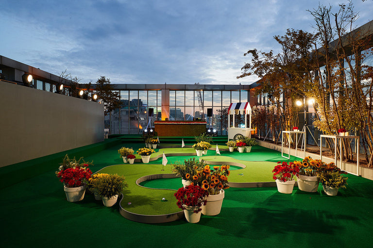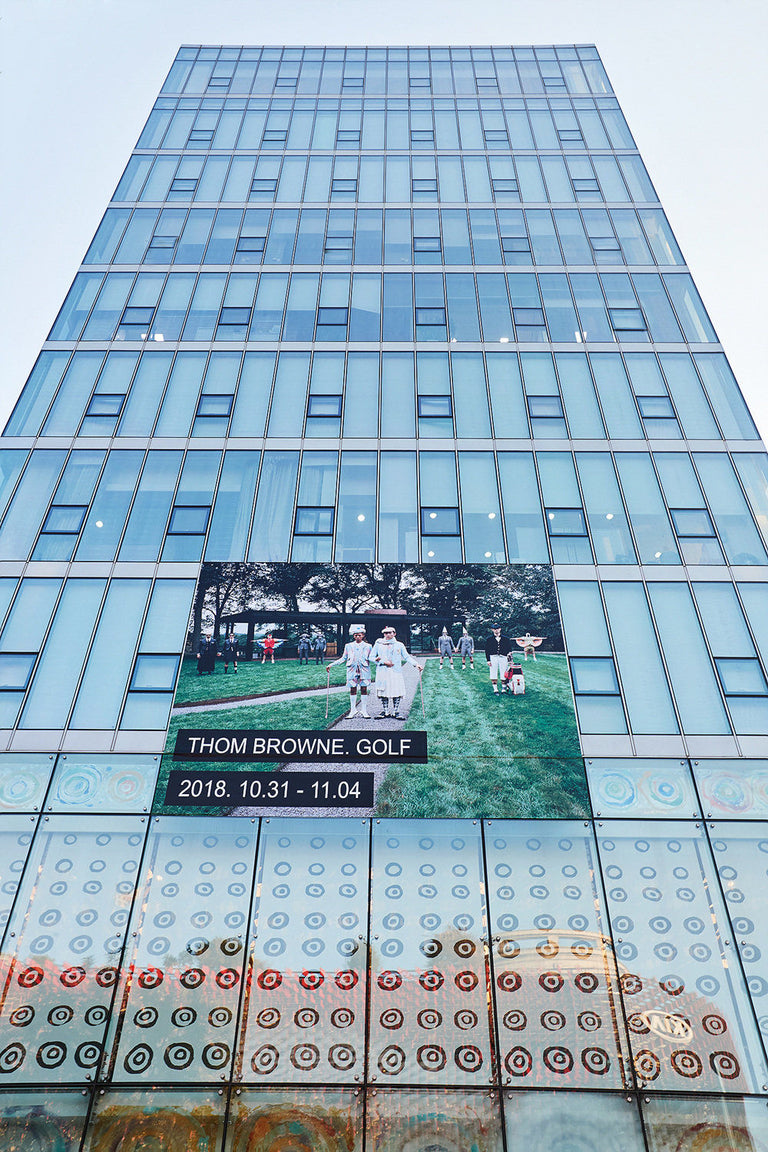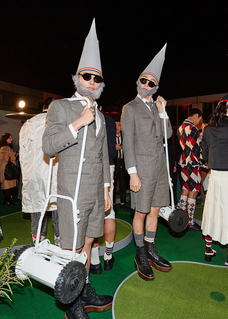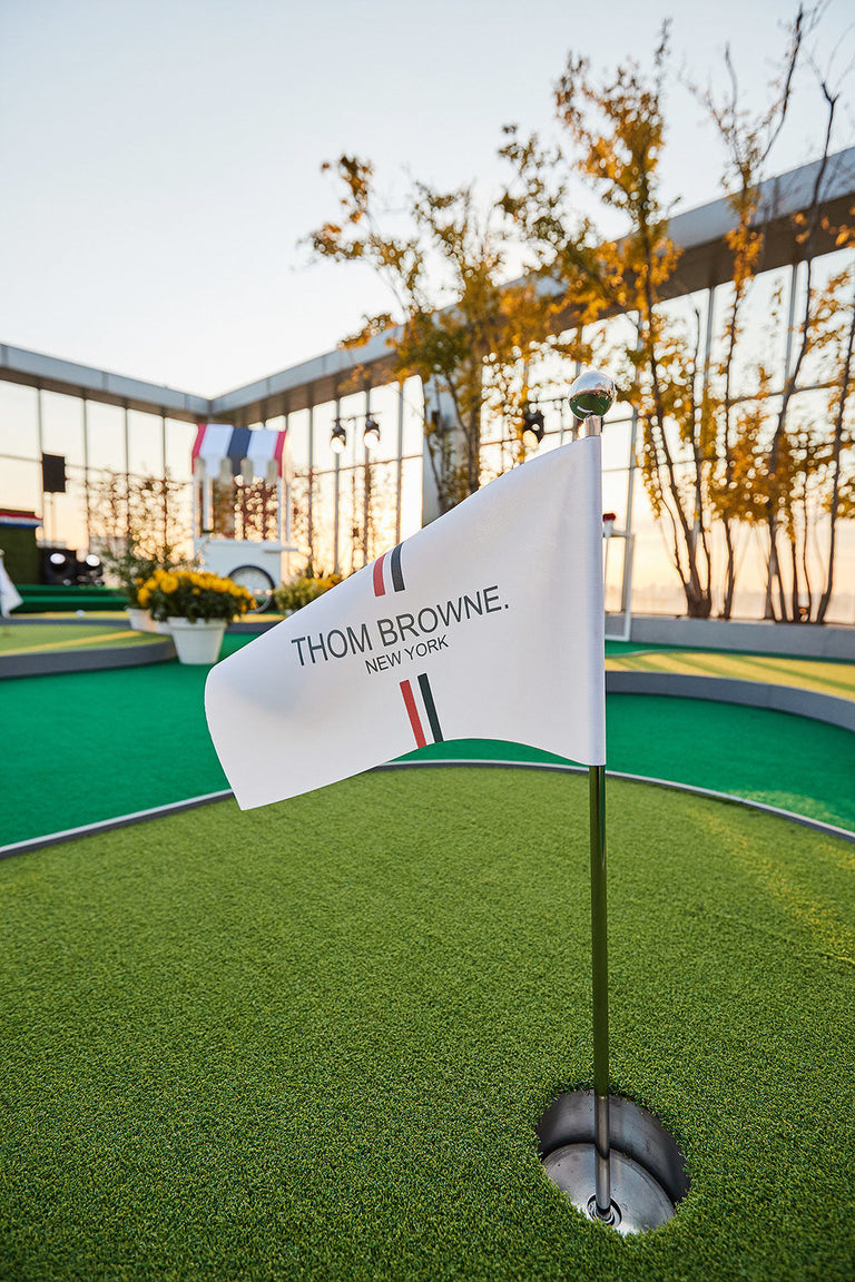 2018 年 10 月。トム ブラウンのゲストは、最新のカプセル コレクションの発売を祝いながら、ソウルの 10 コルソ コモでトム ブラウン ゴルフ ワールドを紹介されました。トム ブラウンの最も有名なキャラクターの 1 つである「ノーム」が、建物の屋上にあるポップアップ ミニ ゴルフ コースを歩き回り、他のゲストには「ヘクター ブラウン」が作ったドリンクが振る舞われました。サンドラ パーク、スンギ イ、テウンなどのゲストがプレーする中、カスタムのトム ブラウンの旗とゴルフ ボールがさまざまなミニ ゴルフ ホールをマークしました。