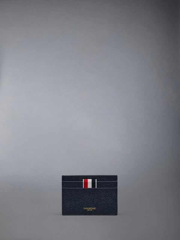 グリーンのペブルグレインレザーを使用した両面カードホルダー。中央にコンパートメントがあり、両側にカードスロットが 2 つあります。ストライプの裏地。片側に金箔プリントのロゴ。片側にシグネチャーストライプのグログランループタブ。