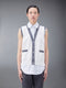 ミラノステッチコットンとオックスフォードを使用したVネックのカーディガンベストとラウンドカラーシャツの組み合わせ。コントラストのあるフレーミングと、左肩に白の4本ストライプのディテール。フロントボタン留め、ストライプ柄のグログランプラケット、フロントスリップポケット2つ。サイドベンツはボタン留めで、シグネチャーストライプ柄のグログラントリム付き。首の後ろにシグネチャーストライプ柄のグログランループタブ。