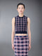 プリンス オブ ウェールズ チェックのカシミアを使用したクルーネック シェル トップ。リブ編みの裾。シグネチャー ストライプ グログラン トリムの付いたボタン付きサイドベンツ。首の後ろにシグネチャー ストライプ グログラン ループ タブ。