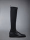 ブラックのストレッチ ヴィテッロ カーフレザーを使用したニーハイ ペニー ローファー ブーツ。同系色のマイクロソール付き。プルオン構造。ブローギング ディテールのエプロン トゥ。レザー ライニング。袖口にシグネチャー ストライプ グログラン ループ タブ。