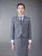 グレーのスーパー 120's ウールツイルを使用したハイアームホール スポーツ コート。全体に白のクジラとヨットのハーフドロップ刺繍が施されています。フロントはボタン留め、ノッチ付きラペル、フロントにフラップポケット 2 つ、胸ポケット 1 つ。キルティング加工のクジラ エルボー パッチ アップリケ、シグネチャー ストライプ グログラン トリムのボタン付き袖口。バック ベントはダブル。ストライプの裏地には内ポケットとネームタグが付いています。首の後ろにシグネチャー ストライプ グログラン ループ タブ。ハイアームホール - フィット 3。