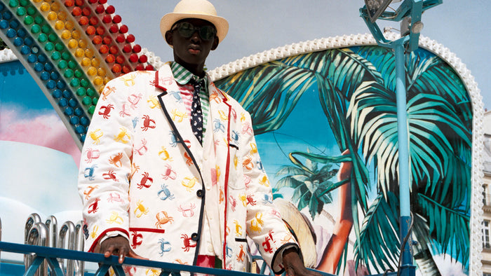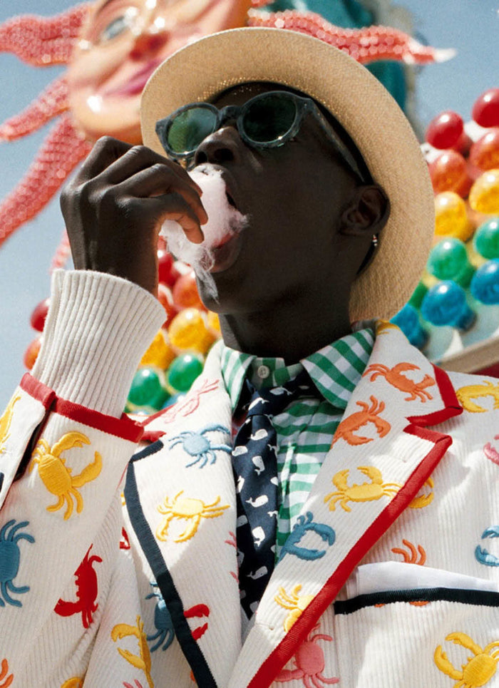 カーニバルでは、スターのキャンディに綿菓子をプレゼント。もちろん、楽しいミックスのショートパンツやレップストライプのネクタイを着けた方が、お菓子はもっとおいしくなります。