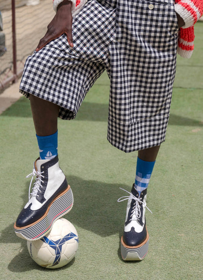 モデルはギンガムストレートフィットオックスフォードシャツ、ネイビーのべっ甲柄サングラス、ファンミックスギンガムミドルソックスを着用しています。