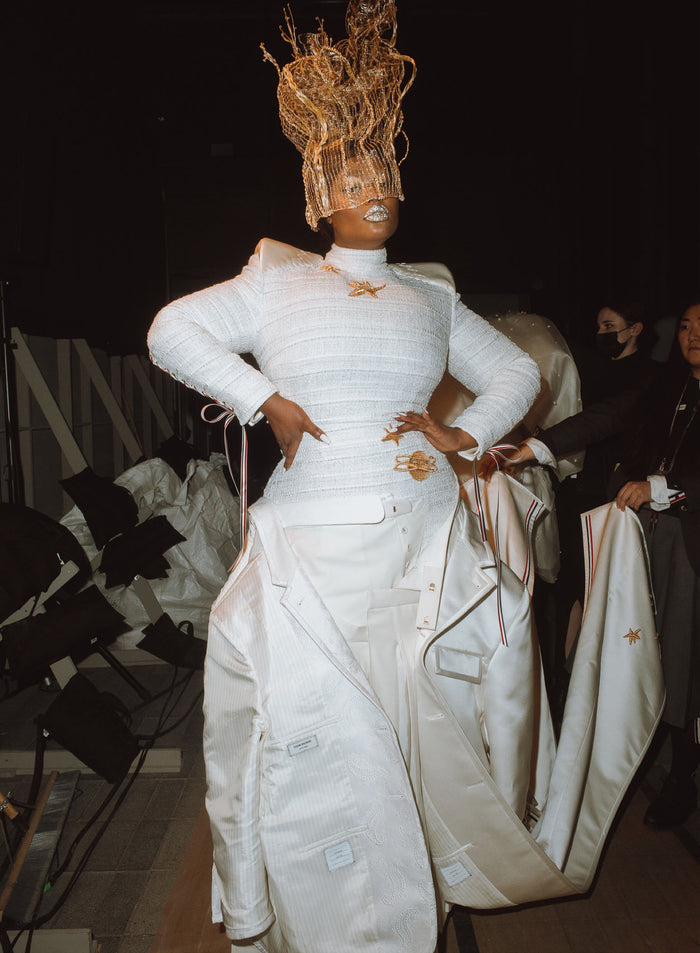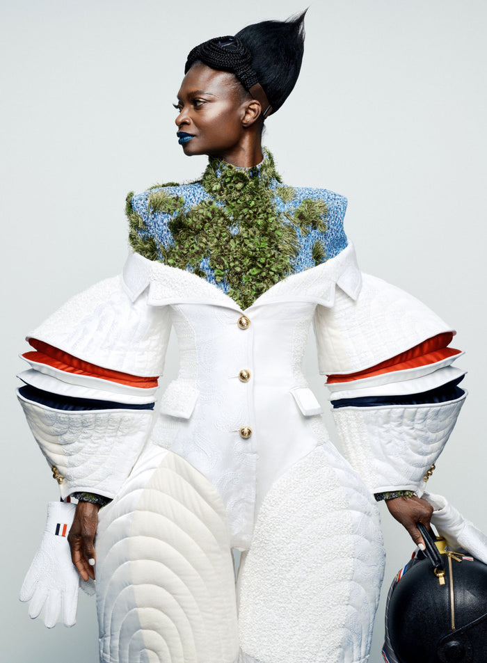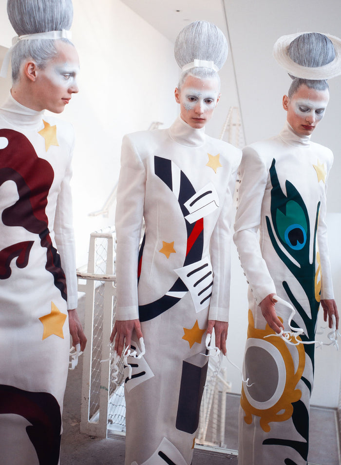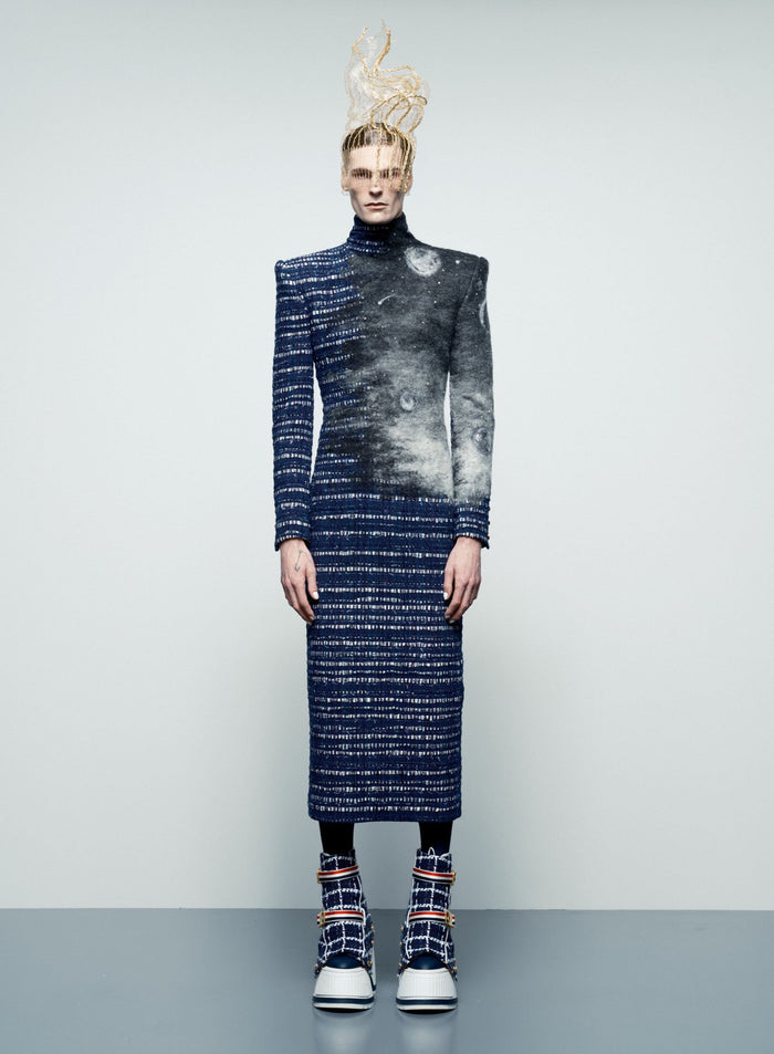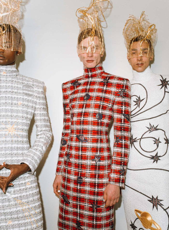 the asteroids… in unique embroidered tweed dresses under deconstructed pinstripe suits, buckled platform astronaut boots, and hand-knitted gold bullion baobab headpieces.