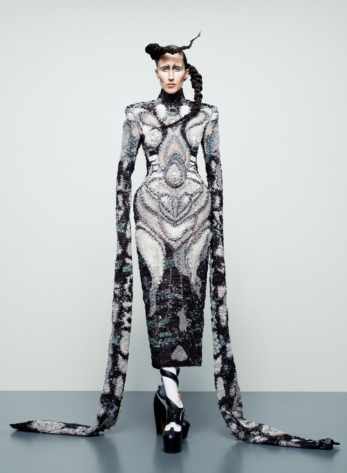 the snake… in an anatomical dress with stacked sequins, individually wrapped in shades of tulle.