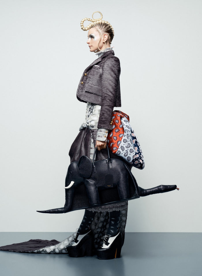 the elephant… in embroidered matte sequin jacket and skirt with an intarsia paisley bow, over a grey hand pulled chiffon tweed dress.