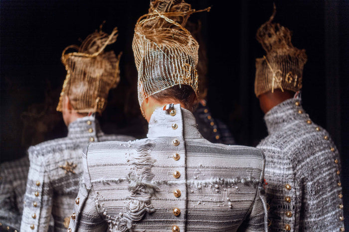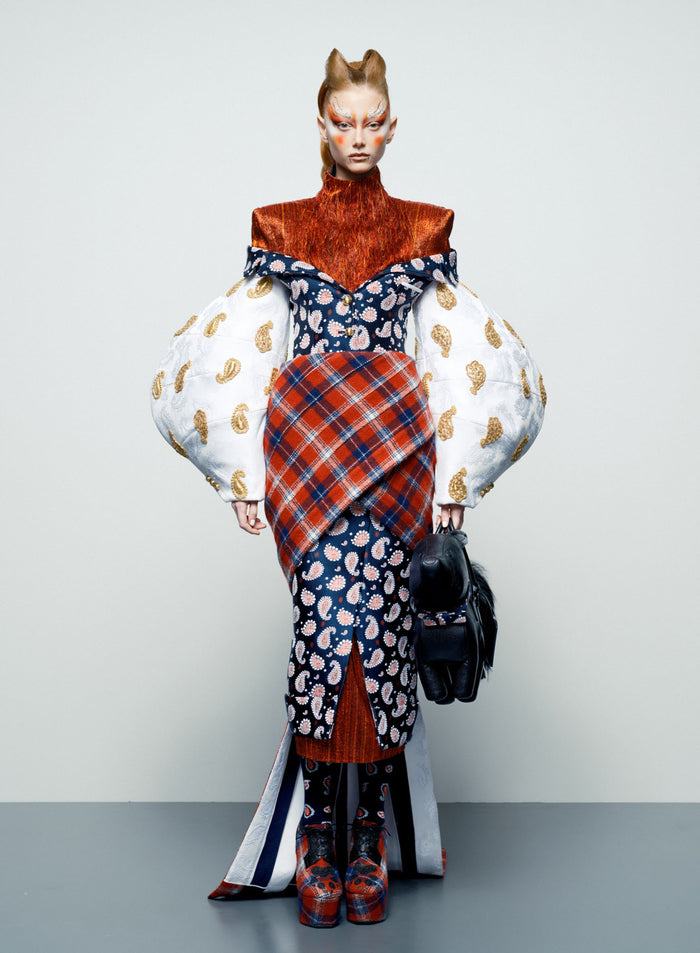 the clocks… in uniform paisley jacquard corsets under oversized, individually hand-woven tweed tailoring with roped shoulders, and crocheted gold metal thread headpieces.