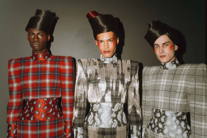 the special rose… in degradé silver and gold bullion embroidered top and skirt, over a full length paisley jacquard dress. the three roses… in molded-shoulder seamless tartan tops and skirts over paisley jacquard dresses.