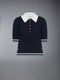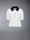 A classic silhouette reinterpreted with Thom Browne precision. This short-sleeve polo is crafted in soft cashmere with a baby cable stitch—referencing heritage knitwear while refining it through subtle texture and a polished finish. A contrast ribbed collar evokes tailored uniform codes, while nautical-inspired anchor buttons and striped tipping ground the piece within the seasonal narrative.