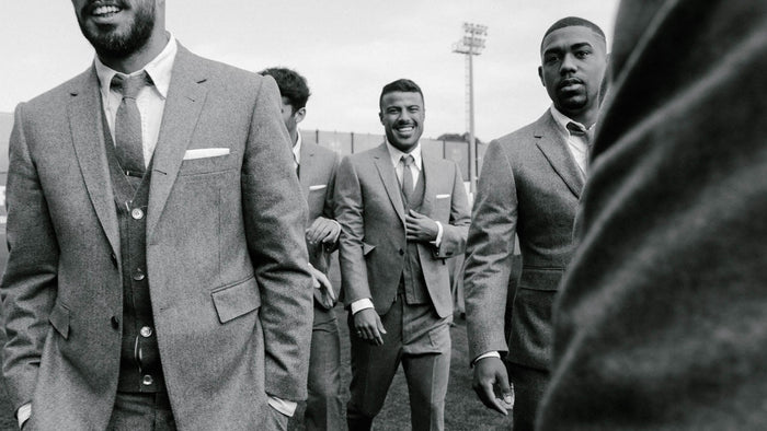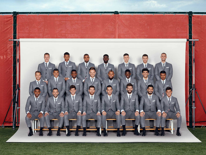 and striding across the pitch is star forward luis suárez with jordi alba and center-back gerard piqué. they’re all smiles as they pose in their hand tailored and fully canvased 3-roll-2 flannel jackets and trousers, both in thom browne’s iconic grey and using classic brown horn buttons.