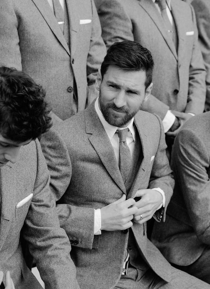 there he is, league leading scorer lionel messi, perhaps the world’s greatest footballer, adjusting his matching suiting fabric tie and sterling silver tie bar with signature red, white, and blue stripe in enamel.